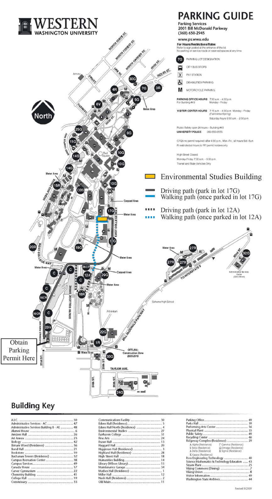 The Geology Department is located in the Environmental Studies (ES) building, on the south end of campus. If driving, obtain a parking permit for either parking lot 12A or 17G from the Campus Services Building near the corner of Bill McDonald Parkway and 21st Street (see map at right). The Geology Department office is located on the second floor in ES 240. If biking, bike parking is available at most entrances to the ES building.